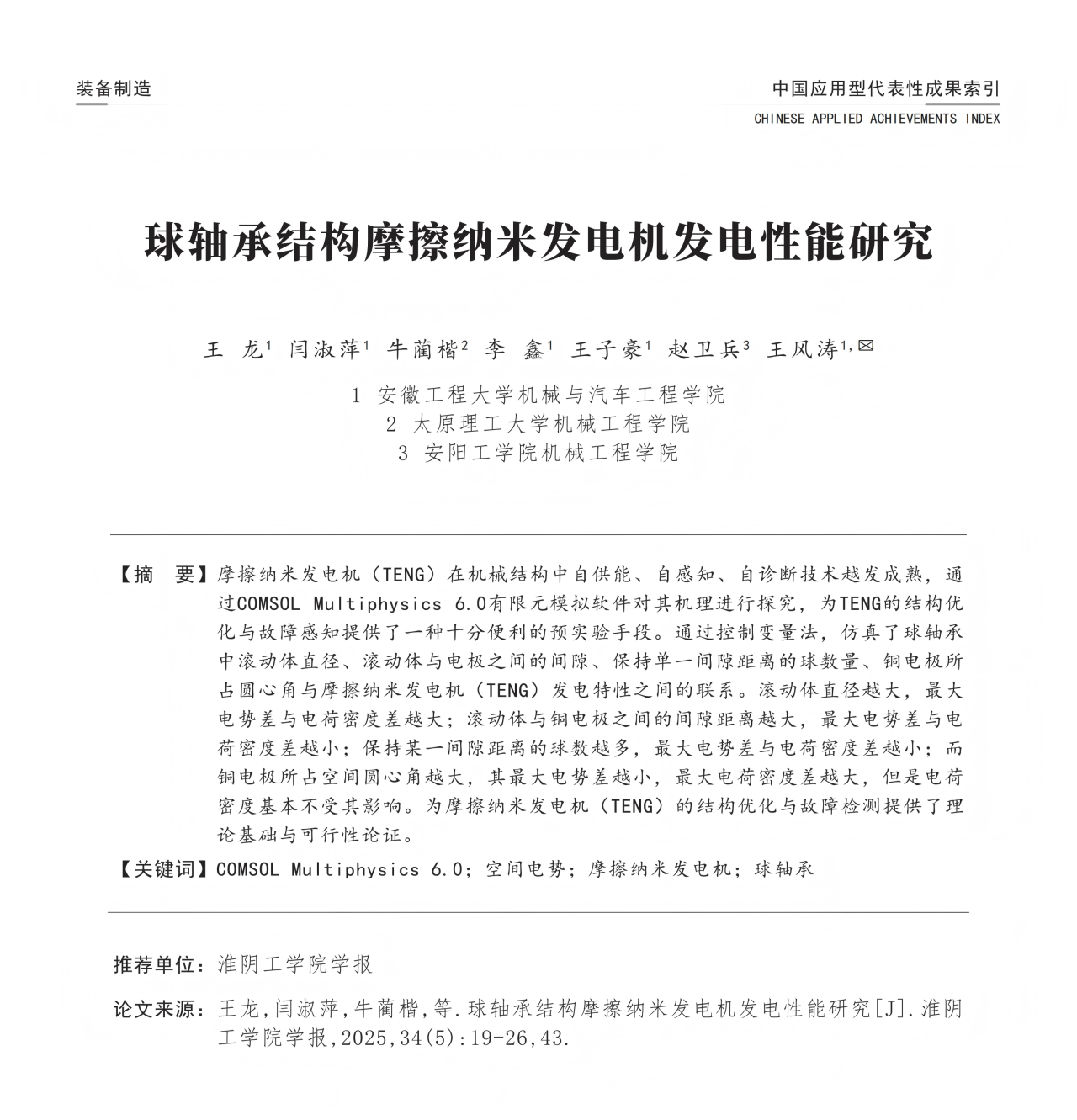 近日,学报2025年第5期刊发的论文《球轴承结构摩擦纳米发电机发电性能研究》成功入选中国应用型代表性成果索引(CAAI)2026年第1期。